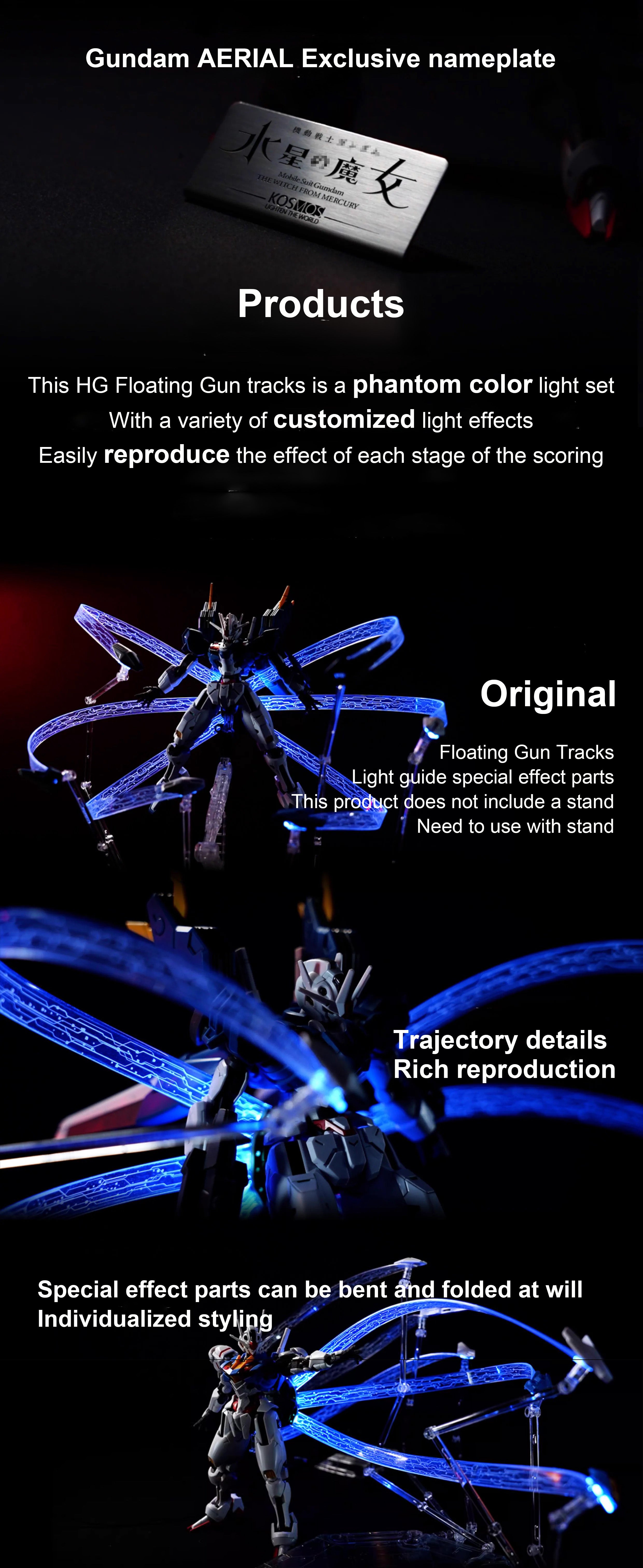 With the KOSMOS HG Gundam Aerial/ Gundam Aerial Rebuild/ Gundam Calibarn Floating Gun Track Light Set, you can take your Gundam to new heights! The included colorful lights will make your Gundam look even cooler and be the envy of your friends. Unleash the infinite possibilities of the creative world and let the power of imagination come to life!