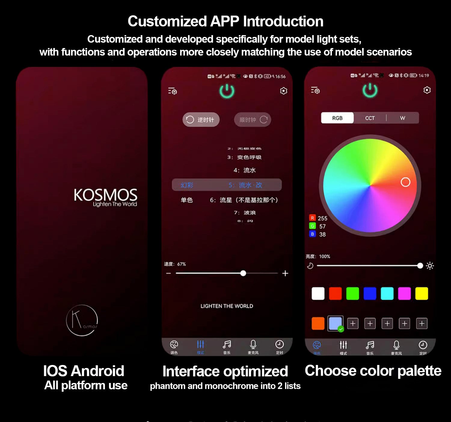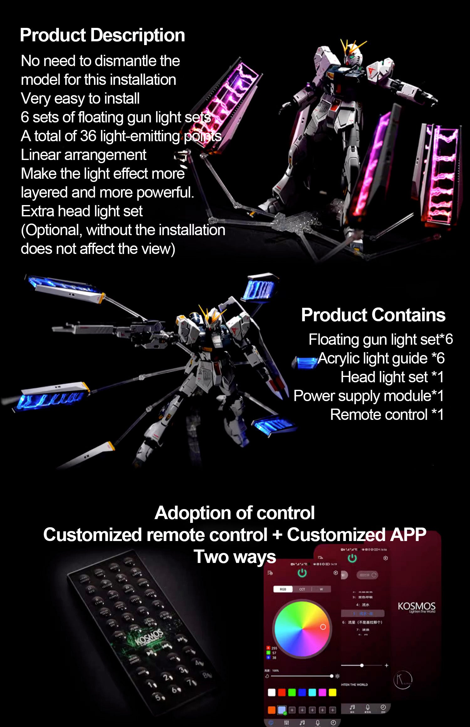 Control, customized remote control + custom APP, two ways.
